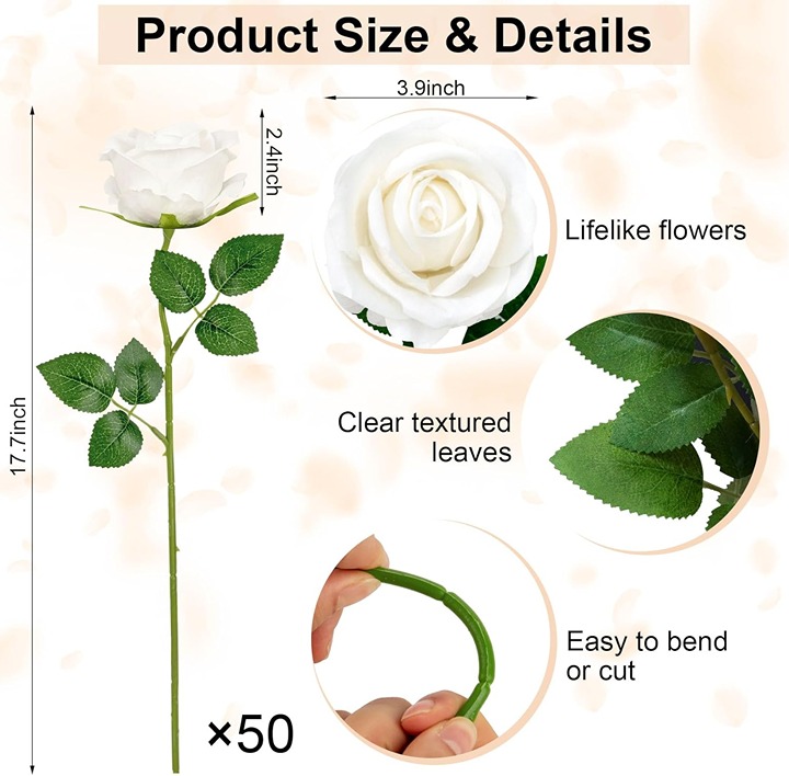 Abundant Quantity: The Valentines Day decor set includes 50 pieces of white roses, the diameter of fake rose is 3.9 inches and the length is 17.7 inches, You will have enough artificial Valentines Day flowers to meet your decoration needs