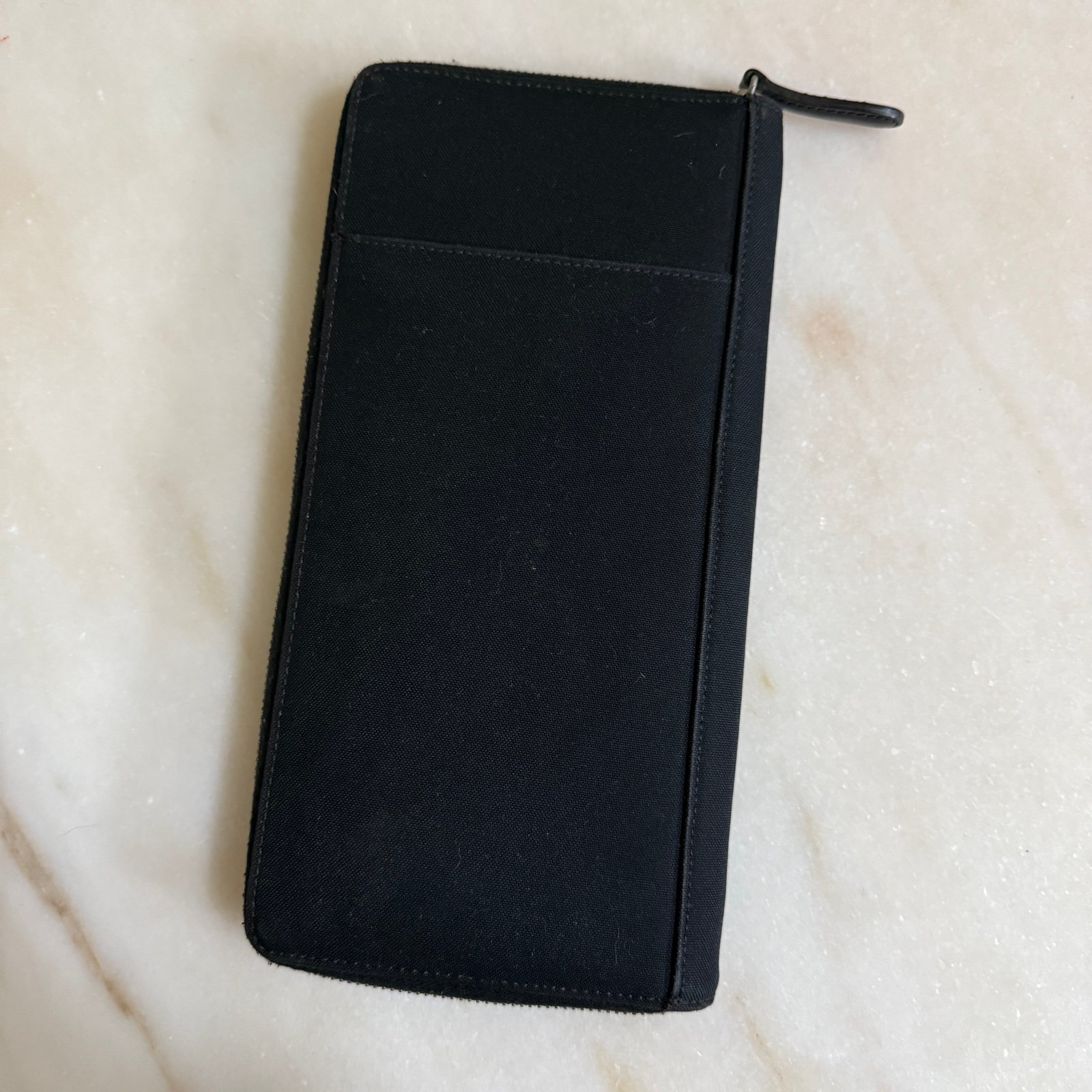 Sleek black leather travel wallet by Coach from the Transatlantic line. Made from sleek and resilient micro-yarn fabric that is wipeable with leather exterior logo and leather interior. Card slots, plane ticket slots, and zippered pocket make for a well-organized trip. Measures approximately 10”H x 5.25”W.
