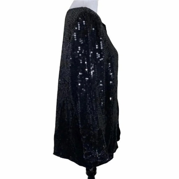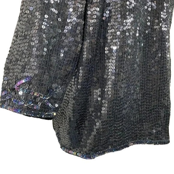 A dazzling black sequin jacket with iridescent beaded embellishments along the open front. This elegant piece features a rounded neckline and long sleeves, designed for a sophisticated statement. Its full sequin coverage creates a captivating shimmer perfect for special occasions like evening events, parties, or a night out.